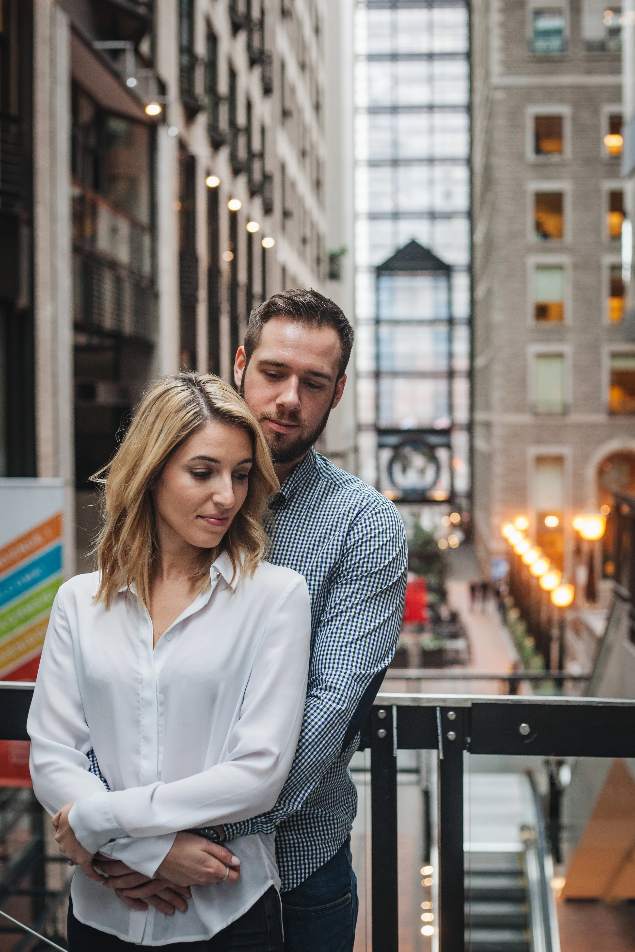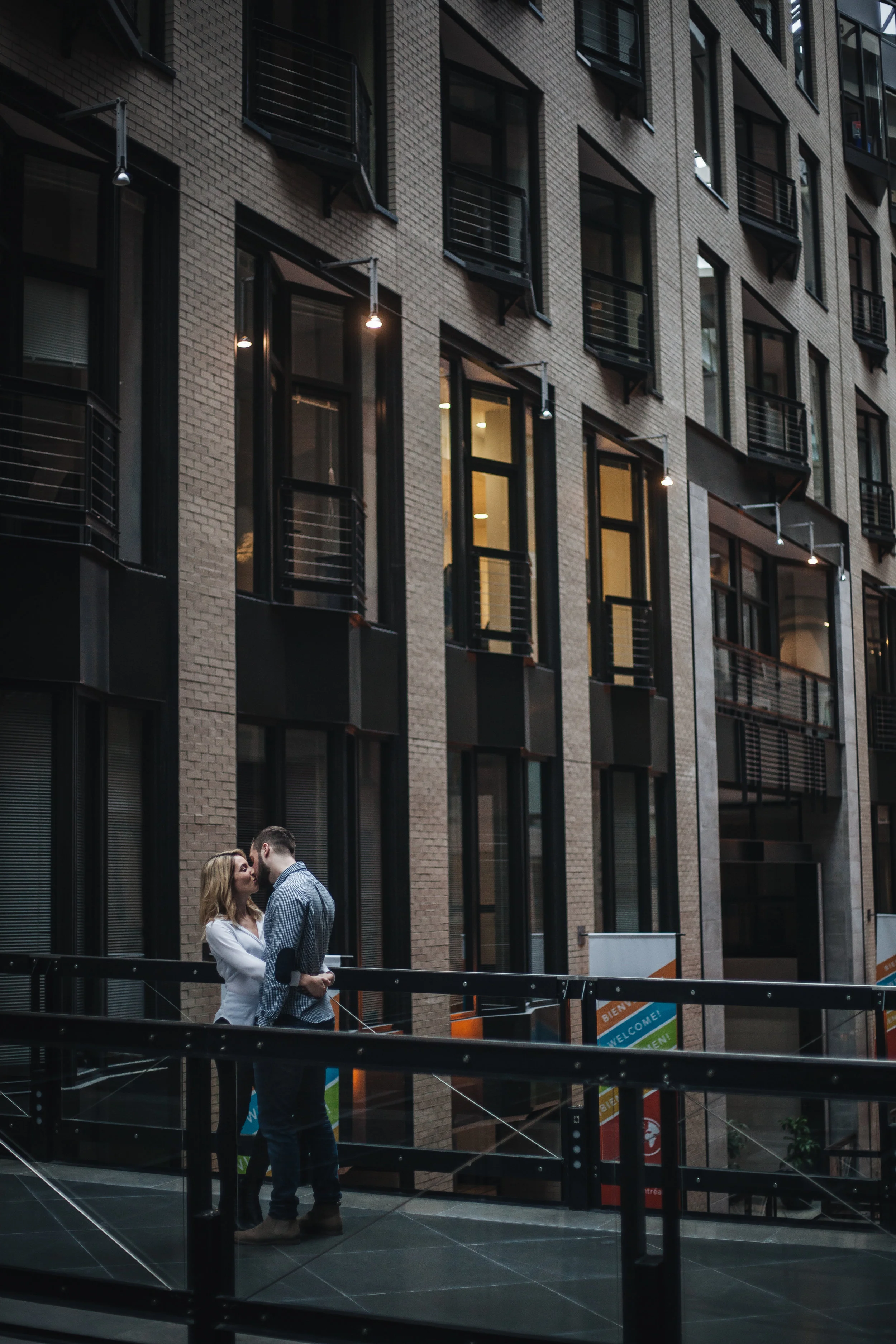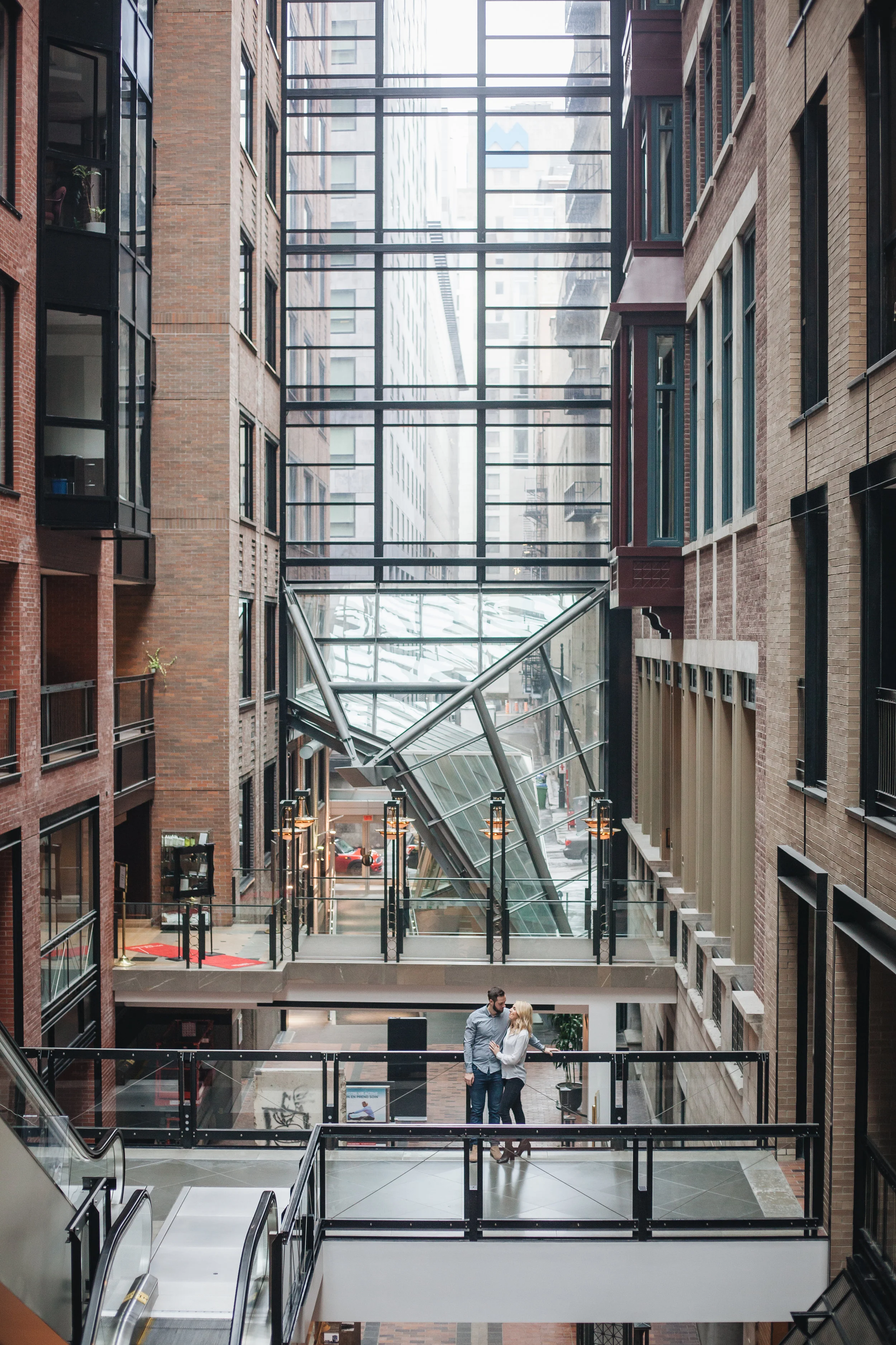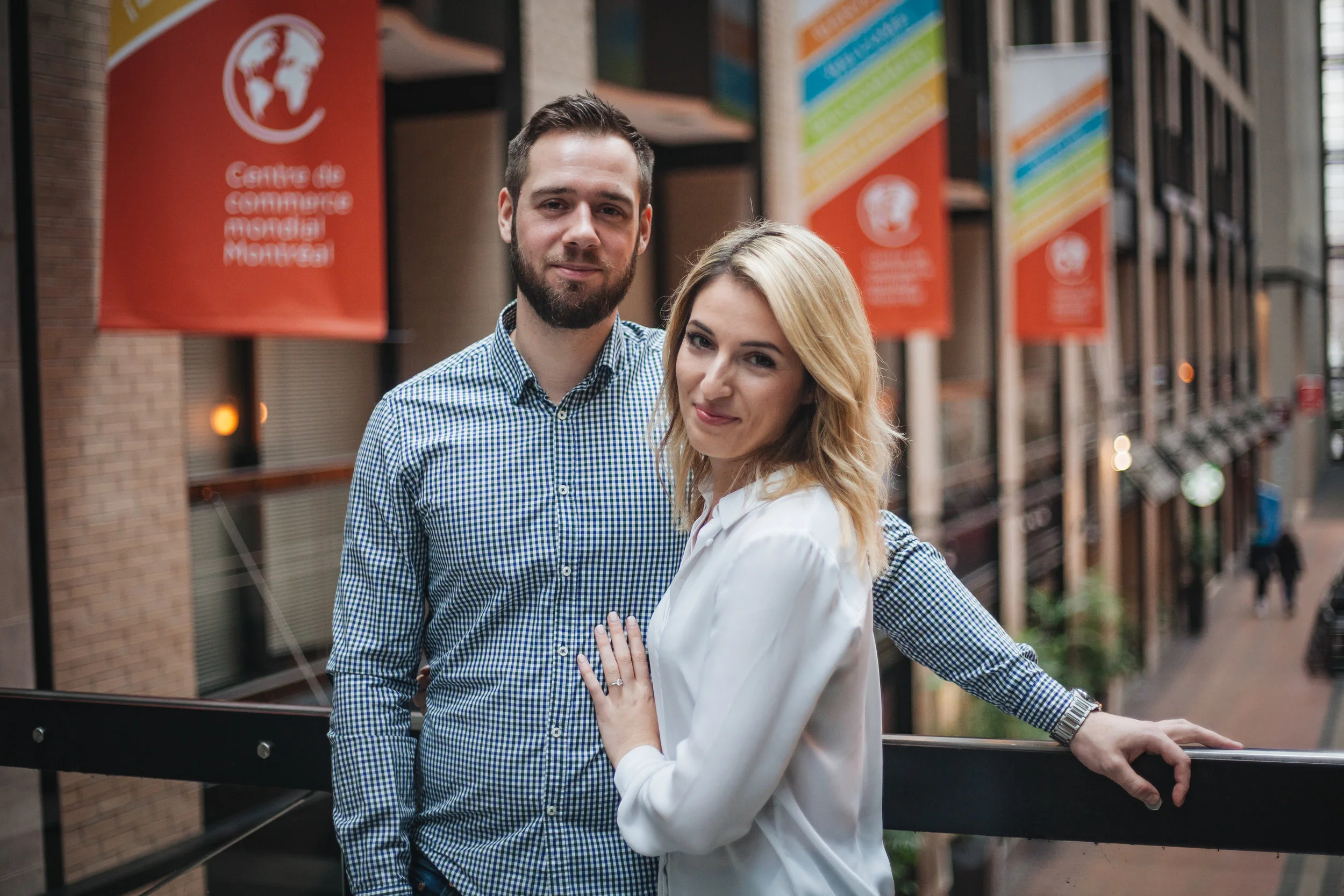 It was a rainy day at the end of April here in Montreal. Katherine and me scheduled the love story session with her fiance Jonah for that day, and in order to avoid the rain, we met up at the World Trade Centre in the Old Port.