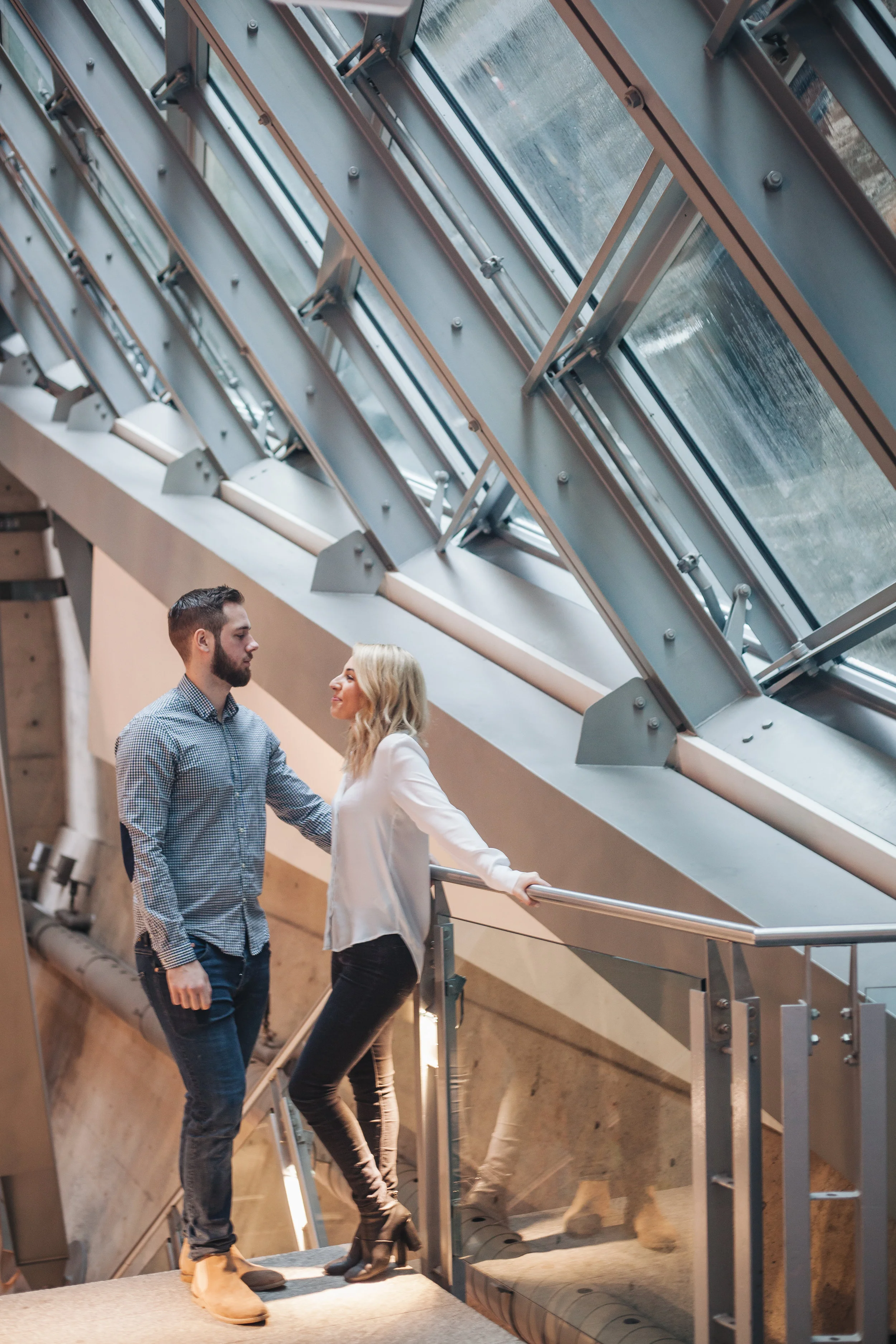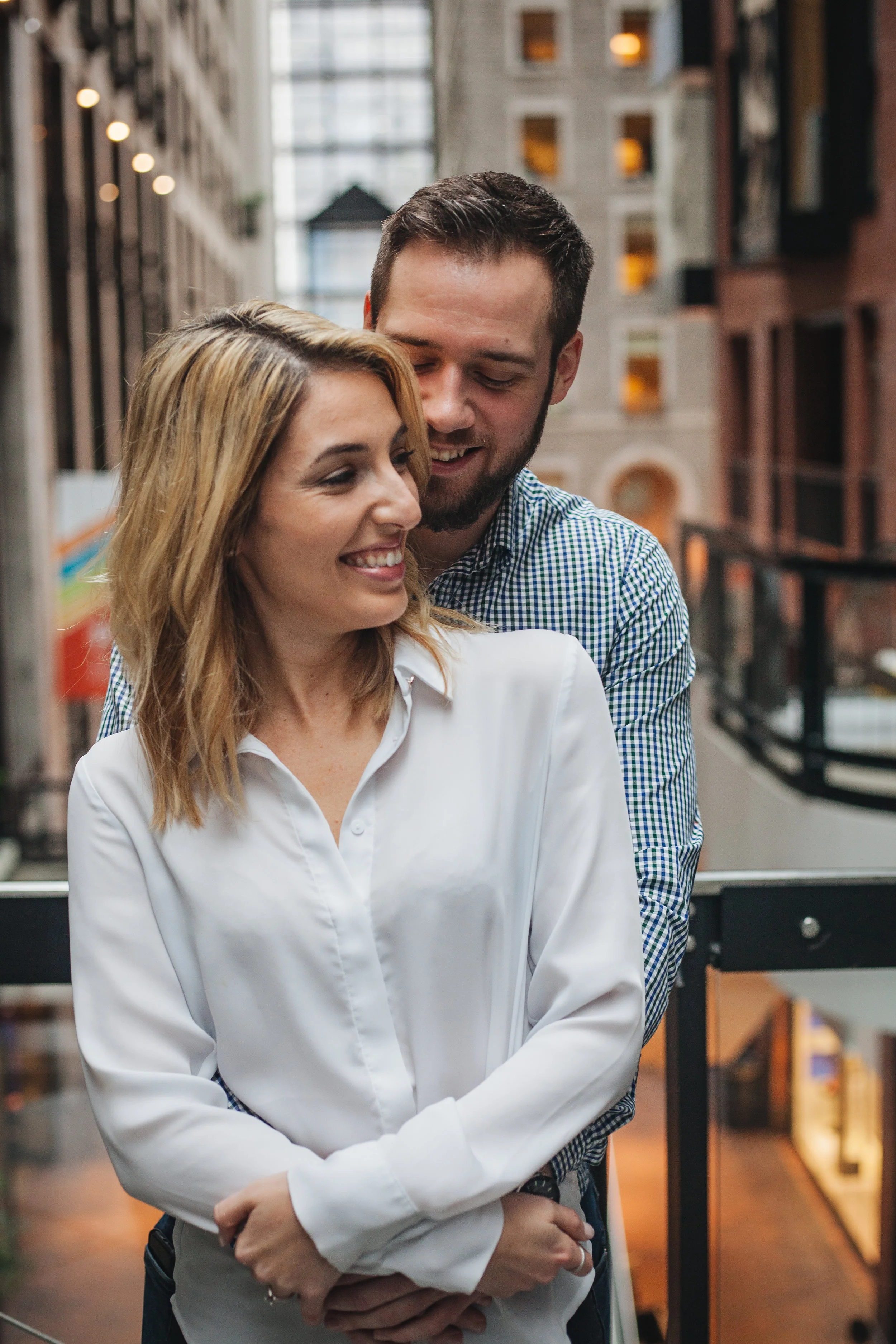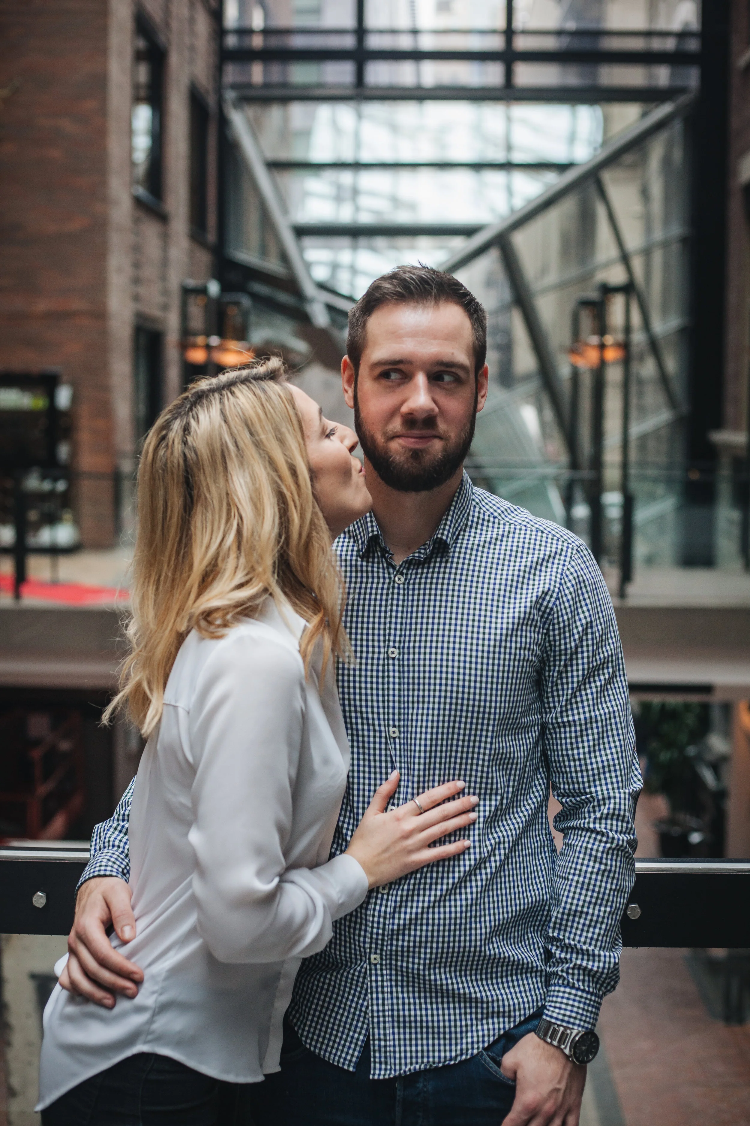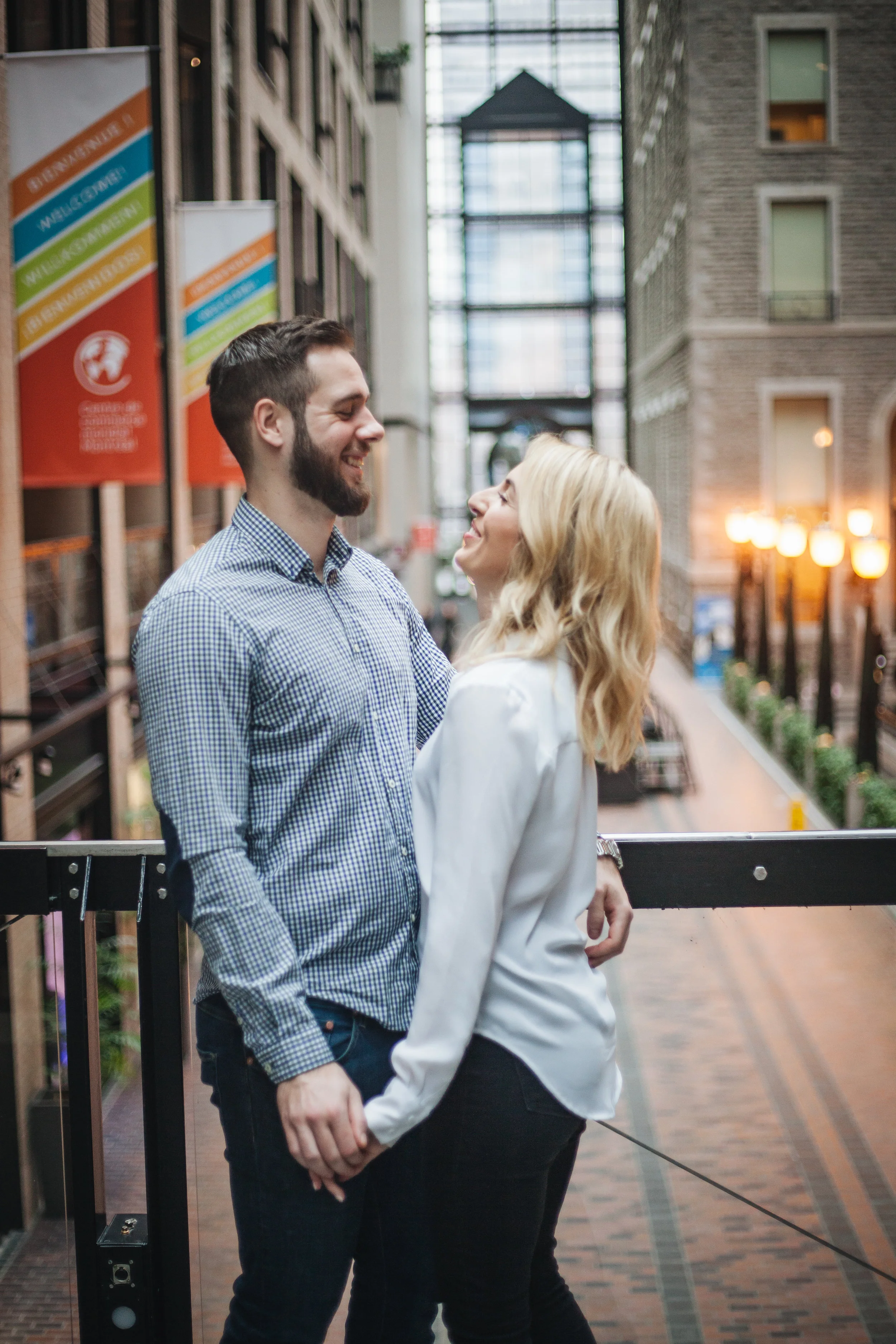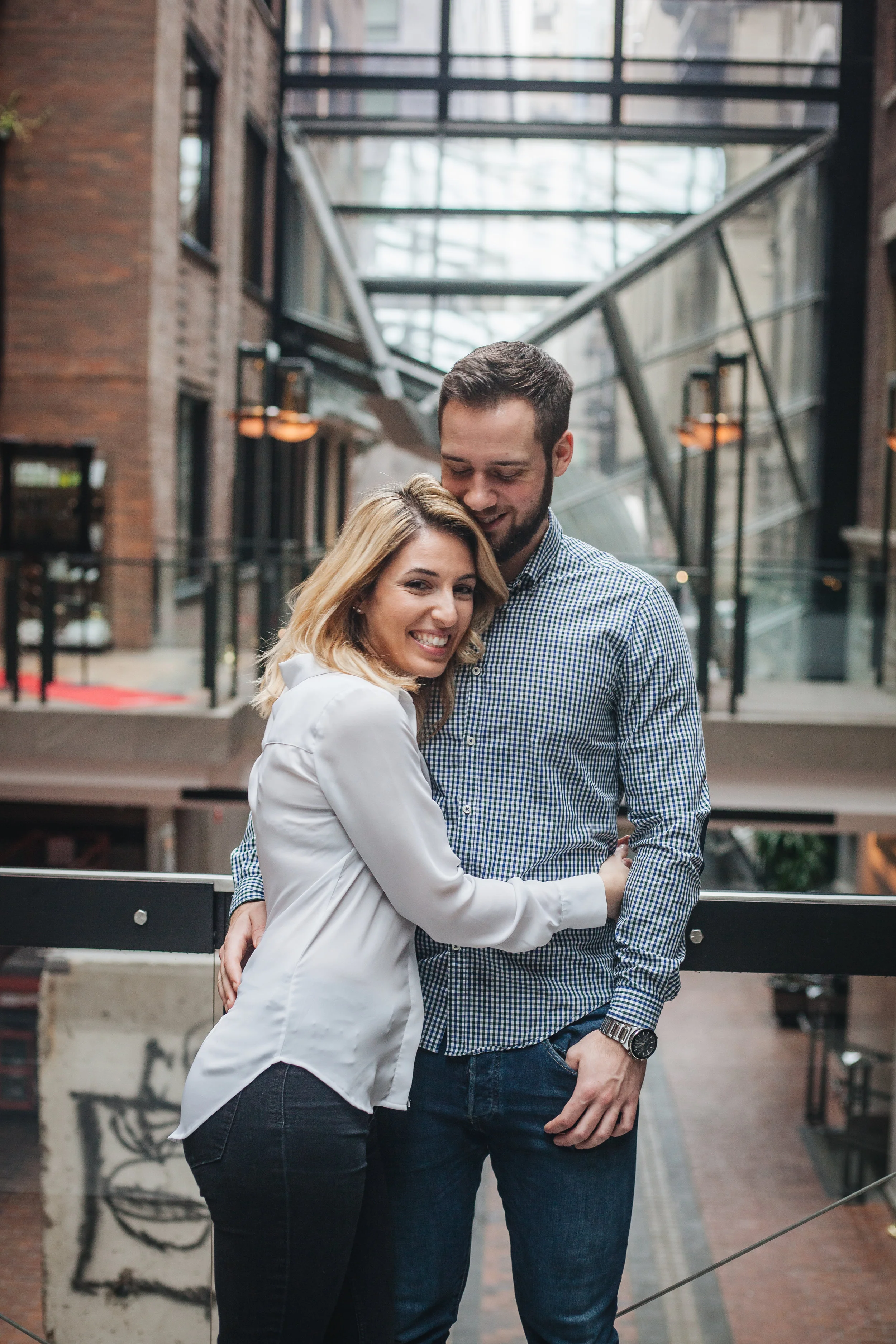 It was a rainy day at the end of April here in Montreal. Katherine and me scheduled the love story session with her fiance Jonah for that day, and in order to avoid the rain, we met up at the World Trade Centre in the Old Port.